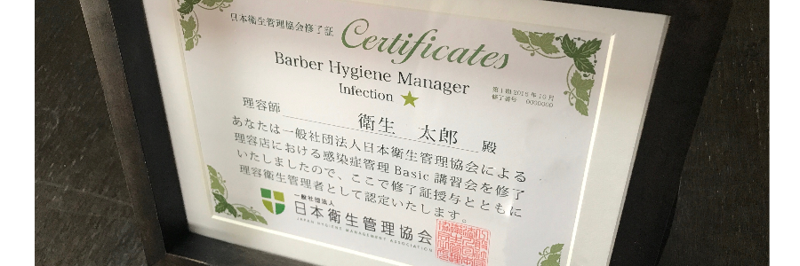 日本衛生管理協会が管理する修了証につきましては、行政が発行する管理理容師免許とは違い、現場の理容師目線で独自に法令遵守の上「衛生管理」を差別化させるための講習会受講者へ授与される修了証です。名称は修了者の職種により変化いたします。