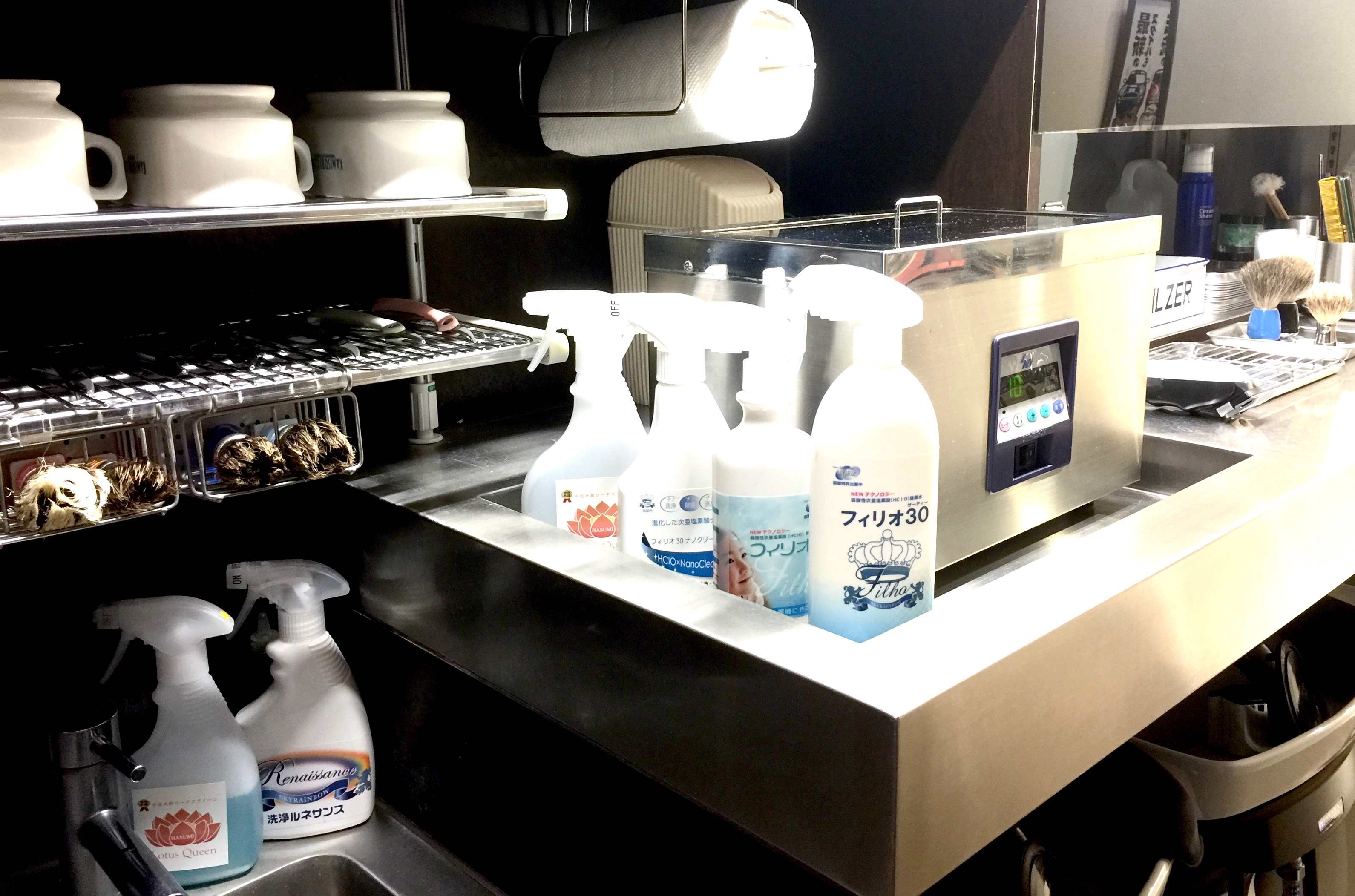 さらに、医療用弱アルカリ性洗浄剤「洗浄ルネサンス」や、同社特許製品でもある中性ナノ洗剤「ロータスクィーン」が加わり「洗浄工程」となり、理容師法における「法定消毒」と組み合わせた「複合洗浄消毒システム」が構築されました。
